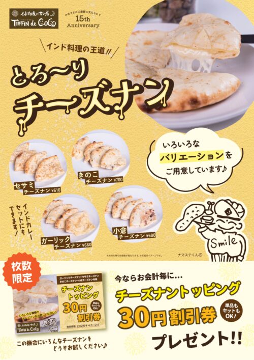 そして、今ならお会計ごとに「チーズナントッピング割引券」プレゼントしております❕